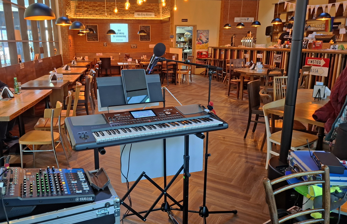 Bei Auftritten in Wien ist die Parkplatzsituation oft eine Herausforderung, doch im huma eleven Einkaufszentrum ist das erfreulicherweise kein Thema. Gäste und Musiker können praktisch bis vor den Eingang fahren, und der flad’nladen liegt gleich in der Nähe eines der Eingänge. So war die Anlage rasch aufgebaut – und nach einem hervorragenden großen Espresso konnte es auch schon losgehen.