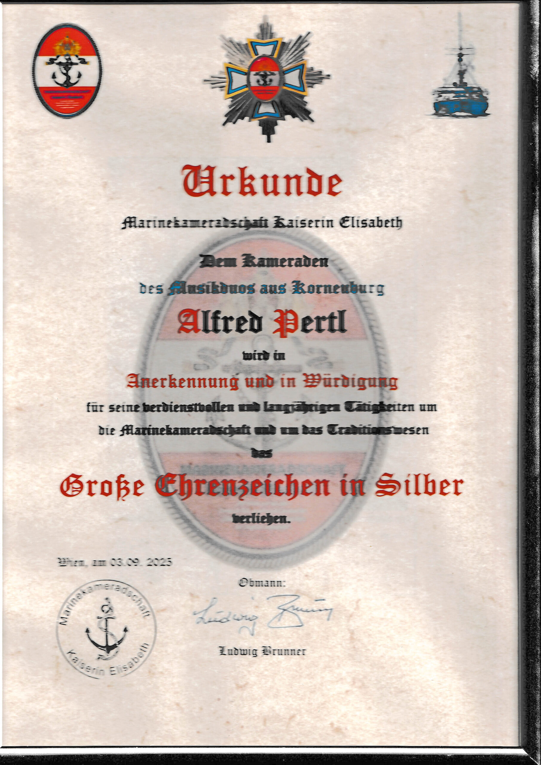 Dieses Mal war die Veranstaltung jedoch etwas ganz Besonderes für uns. Obmann Ludwig Brunner nahm zahlreiche Ehrungen vor – und zu unserer großen Überraschung wurden auch wir ausgezeichnet. Wir erhielten das „Große Ehrenzeichen in Silber“ der Marinekameradschaft Kaiserin Elisabeth als Anerkennung für unsere verdienstvolle und langjährige musikalische Tätigkeit. Diese Ehrung hat uns sehr gefreut, denn im Laufe der Jahre haben wir bei der Marinekameradschaft viele Freundschaften geschlossen und kommen immer wieder sehr gerne zu deren Veranstaltungen, um musikalisch mitzuwirken.