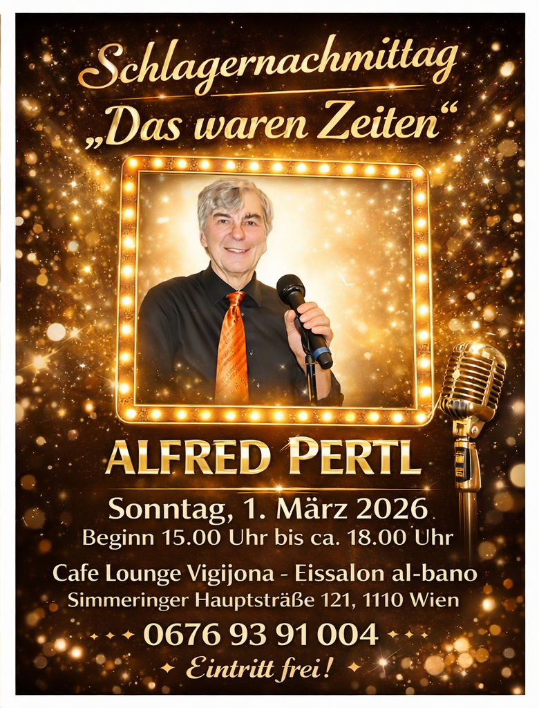 Am Samstag, dem 24. Jänner 2026 spiele ich einen Schlager- und Evergreen-Nachmittag im der „Cafe Lounge Vigijona – Eissalon al-bano“ in Wien Simmeringer Hauptstraße 121. …